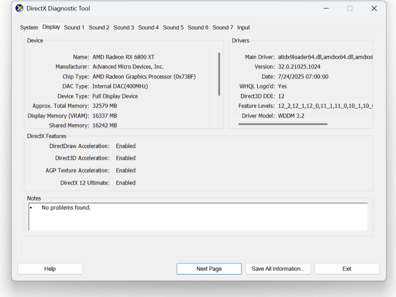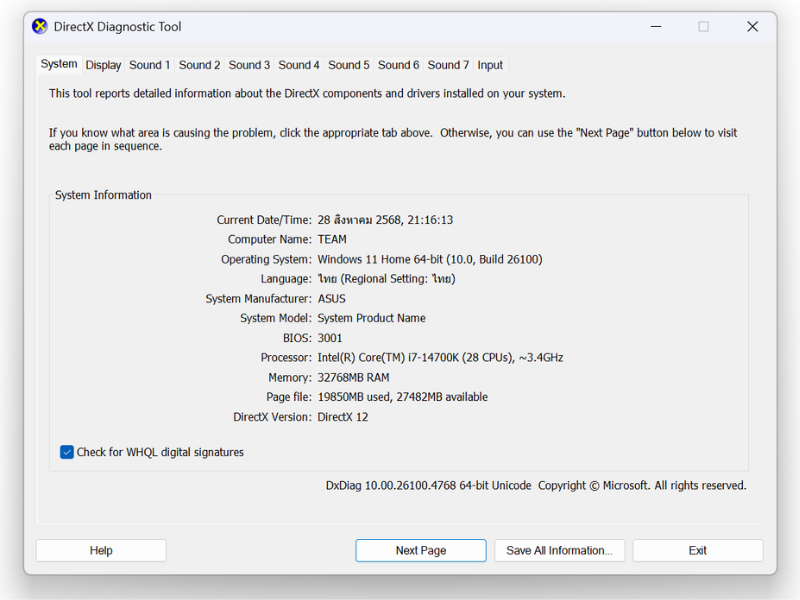 3. จะมีหน้าต่าง DirectX Diagnostic Tool โชว์ข้อมูล