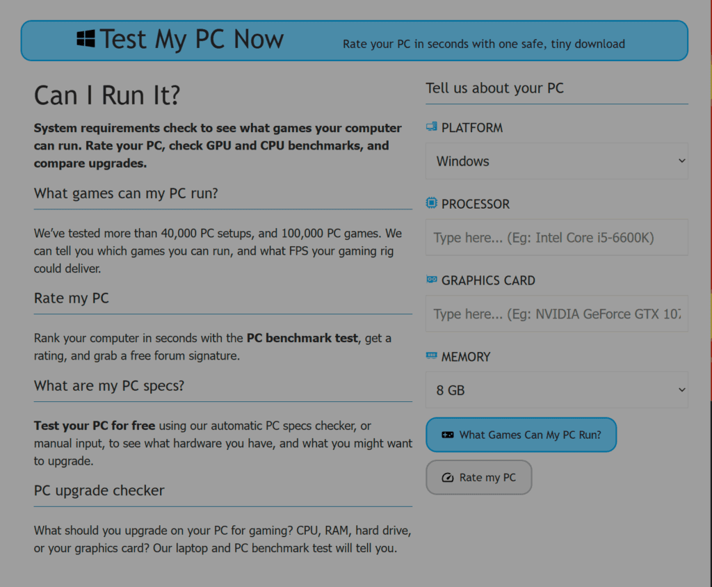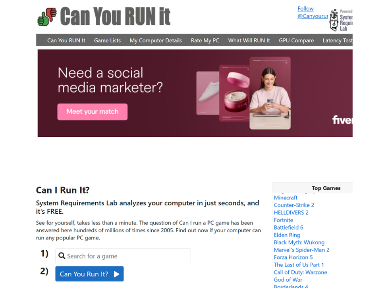 • Can You RUN It → ใส่ชื่อเกมแล้วกดเช็ก ระบบจะเปรียบเทียบสเปกให้อัตโนมัติ