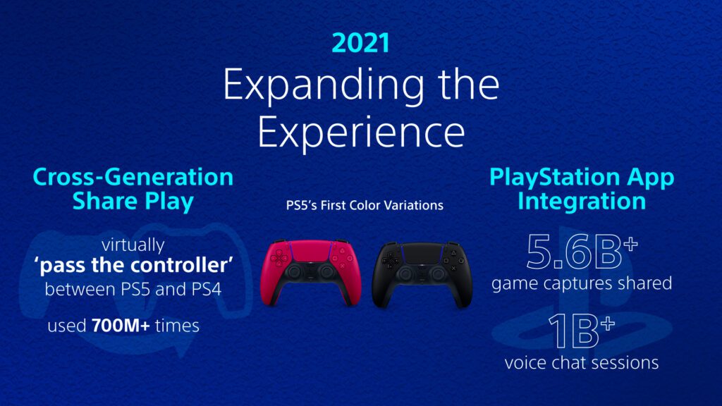 - ปี 2021 ยังได้เปิดตัว สีสันแรก ของ PS5 – Midnight Black และ Cosmic Red – ทำให้ผู้เล่นมีวิธีปรับแต่งคอนโซลและอุปกรณ์เสริมในสีที่พวกเขาชื่นชอบได้มากขึ้น